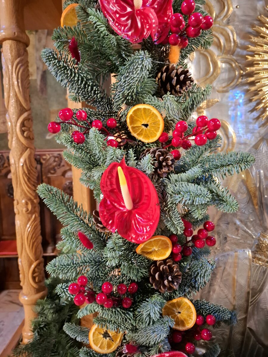 Un rol aparte l-au avut cei care, cu discreție și dăruire, au împodobit biserica. Aranjamentele din ramuri de brad, portocală și flori de anthurium, așezate cu migală la icoane, au adus un parfum cald de iarnă și o notă de eleganță.