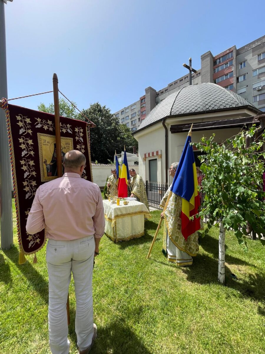 Am ascultat Imnul național „Deșteaptă-te, române!” în interpretarea emoționantă a corului parohiei care a fost susținut discret de vocile și inimile celor prezenți și apoi cu tricolorul înainte am pornit într-o frumoasă procesiune spre curtea bisericii.