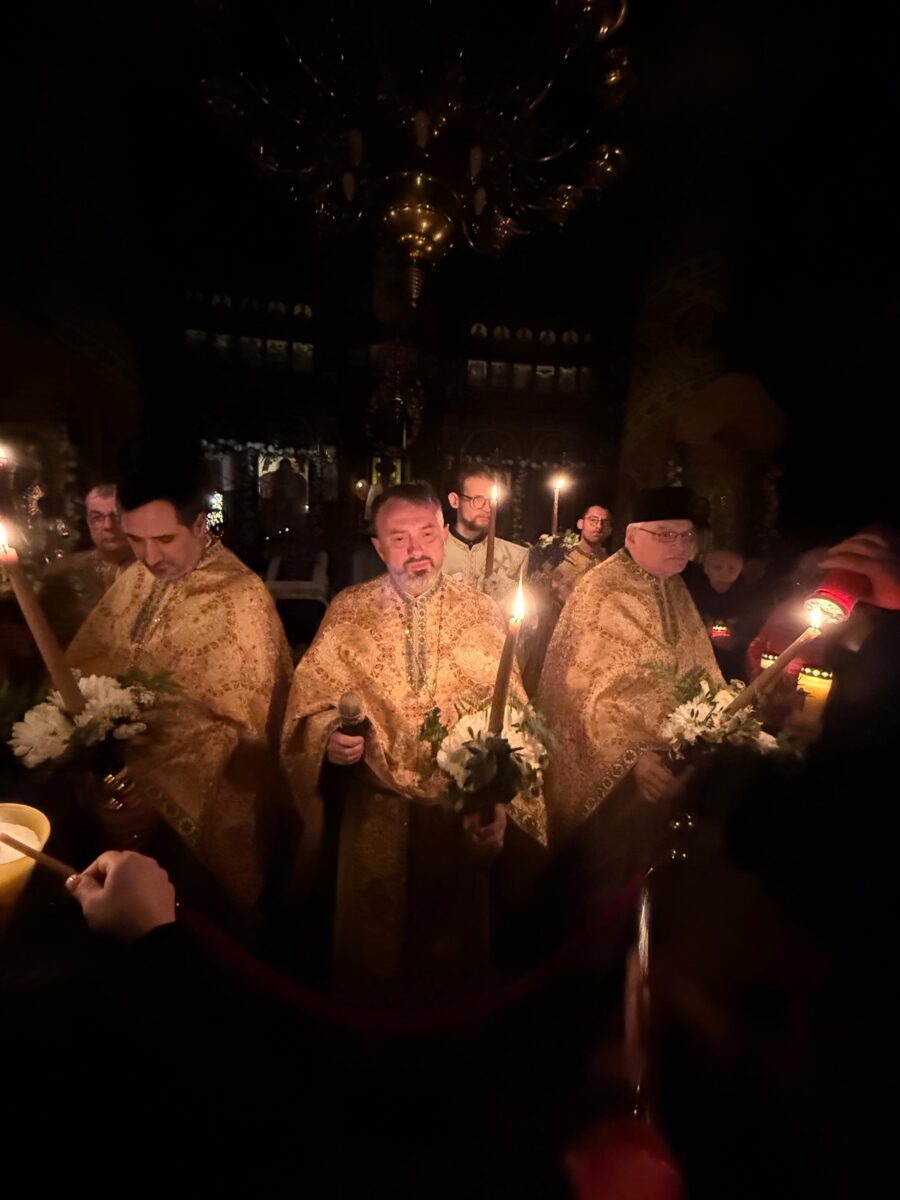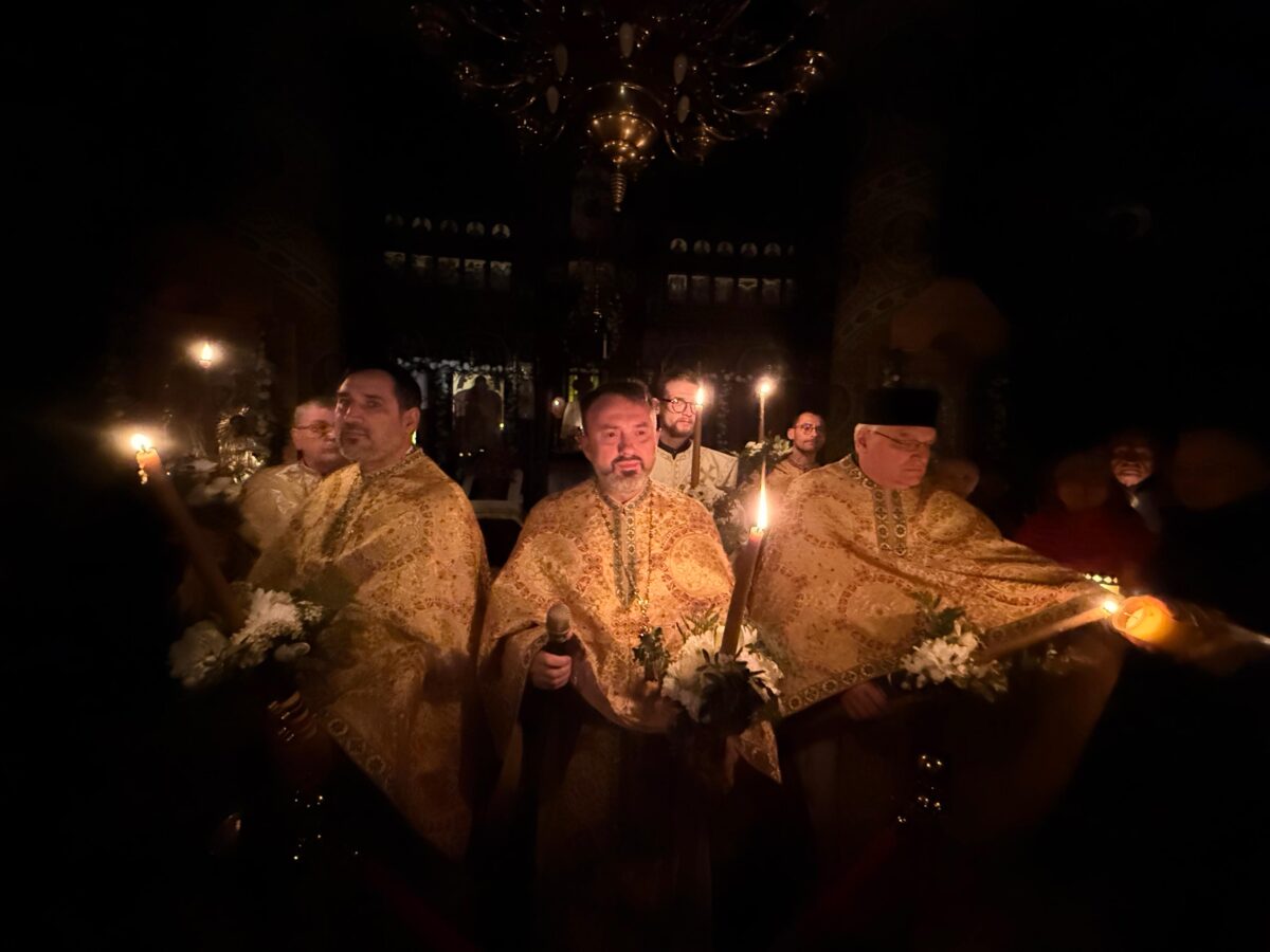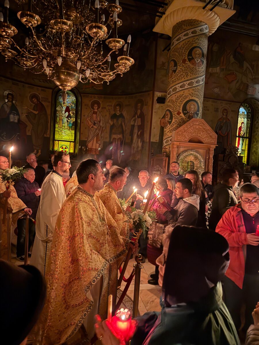 Cântarea corală a adus un plus de frumusețe și profunzime slujbei. Corul mixt „Sfântul Ioan Maximovici” a oferit nu doar răspunsuri liturgice, ci o mărturie vie, în care „Hristos a înviat!” cântat coral a fost simțit cu putere în inimile tuturor, unind glasurile și sufletele într-o singură rugăciune.